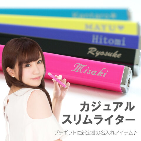 出荷日からお届けまでの目安はコチラ >> 商品情報 【 名入れOK! カジュアルスリムライター 】 ■女性への贈り物に、ロングボックスにも入るスリム設計のガスライター シンプルで上品なデザインが女性に大人気◎ 香水のアトマイザーのような佇まいで、ポーチに入れていても違和感なし! さらに選べる5色の本体カラーと5つの書体の名入れで世界に1つのライターに。