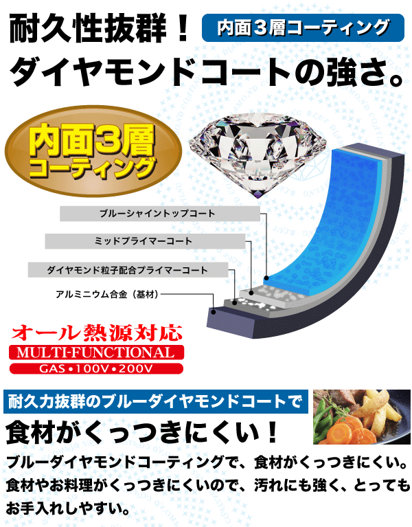 商品情報 耐久性抜群!ブルーダイヤモンドコートの選べるフライパンシリーズ! キズに強く、汚れに強い!ダイヤモンド粒子を配合したブルーダイヤモンドコーティング加工の取っ手のとれるフライパンシリーズです。